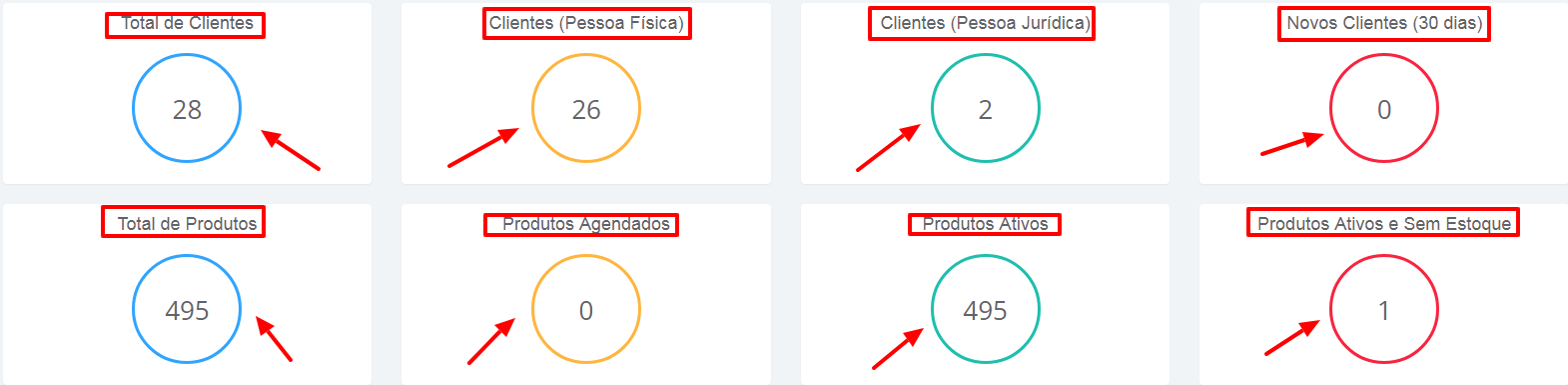 No dashboard também é possível saber algumas informações gerais como o total de clientes, quantos desses são pessoa física ou quantos são pessoa jurídica. Quantos novos clientes se cadastraram nos últimos 30 dias, depois o total de produtos cadastrados na loja virtual, desses quantos estão agendados para aparecer em uma data futura.