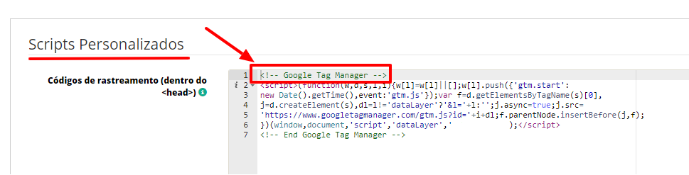 Logo o único código que deve permanecer na sua loja virtual é o do Google Tag Manager, dessa forma: