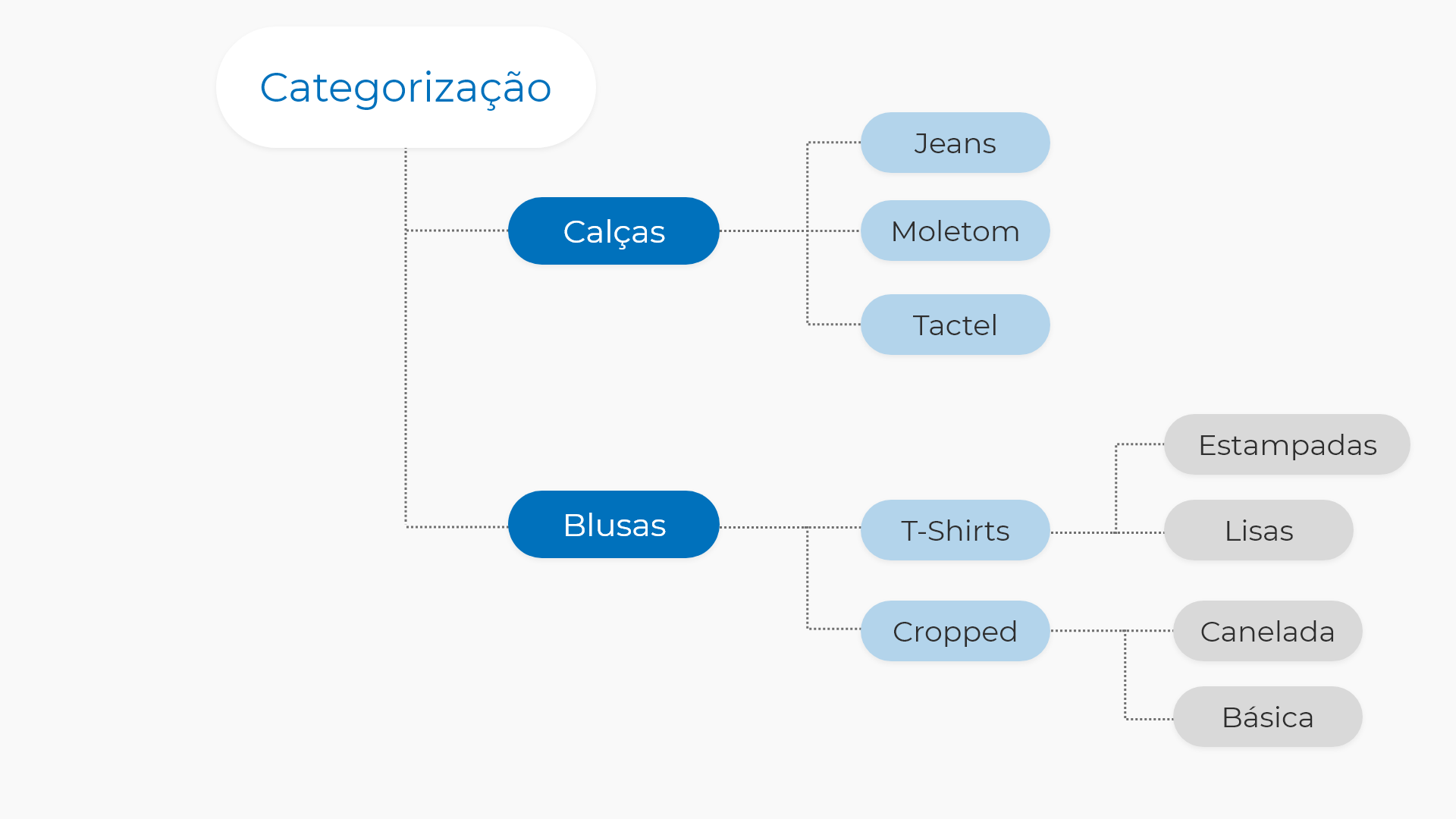 As subcategorias fazem parte de uma estrutura hierárquica, na qual existe uma categoria pai e uma ou mais categorias filhas. Todas pertencem à mesma família de produtos, porém em níveis diferentes de organização.
