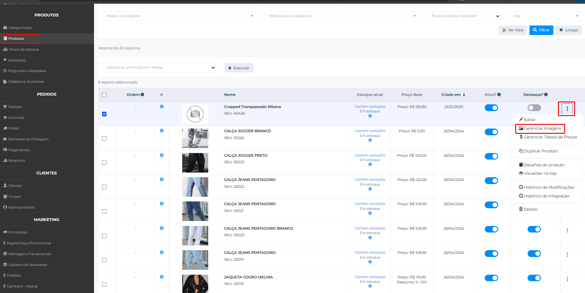 2.Na lista de produtos, clique no nome do produto que você deseja editar. Você também pode usar os filtros de busca para encontrar o produto mais rapidamente.