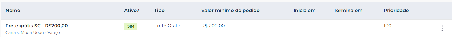 Quando criada, foi desenvolvido uma regra de frete/promoção, onde se o valor de compra for igual ou maior a R$200,00, o mesmo recebrá frete grátis caso seu CEP de entrega resida dentro do estado de Santa Catarina.