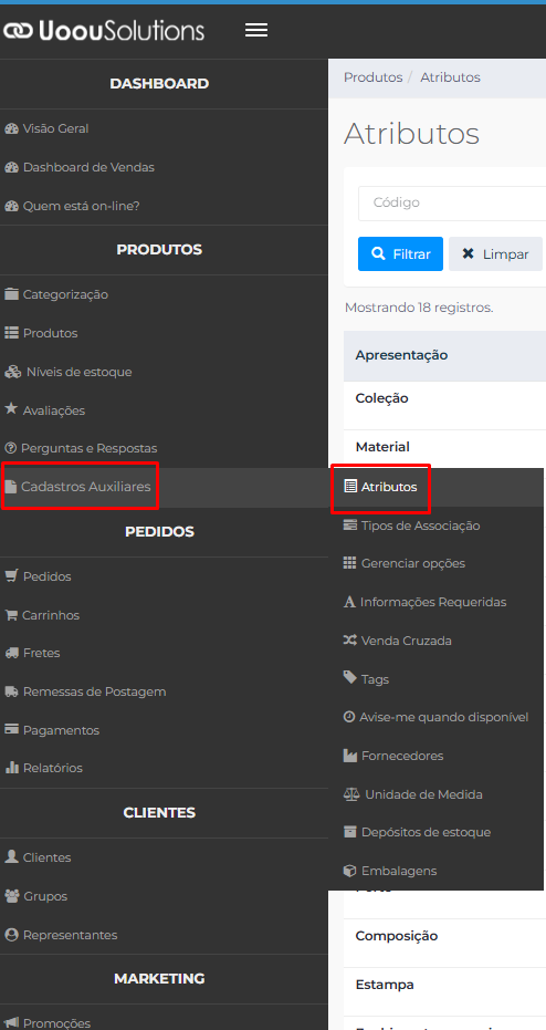 1.No painel administrativo, navegue até Produtos > Cadastros Auxiliares > Atributos.