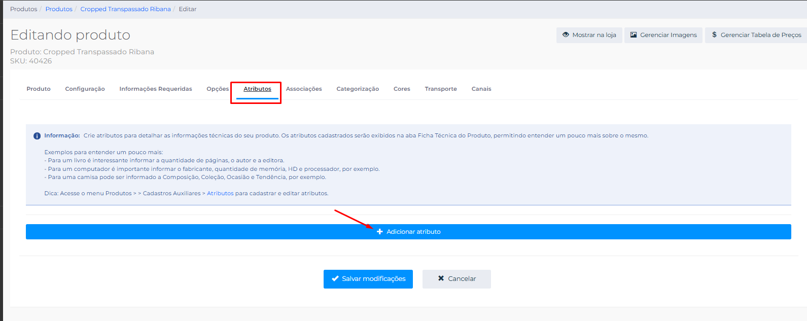 3.Você será levado à tela de edição completa do produto. Clique na aba "Atributos".