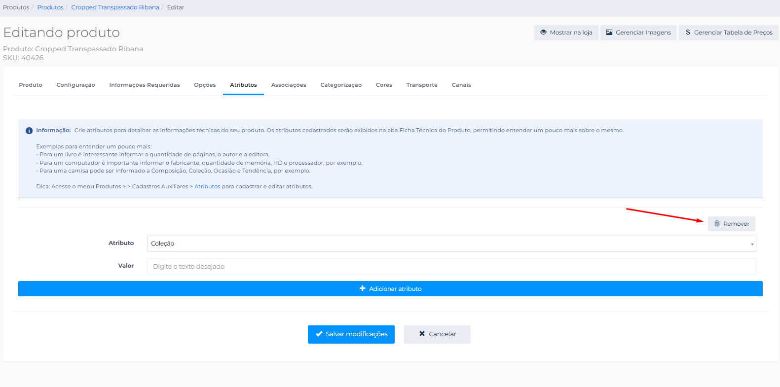Se precisar desvincular um atributo, basta clicar no botão "Remover" localizado na mesma linha do atributo que deseja excluir.