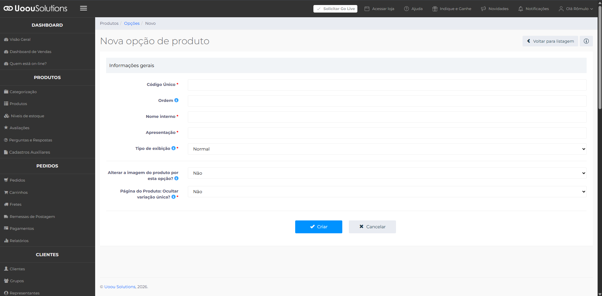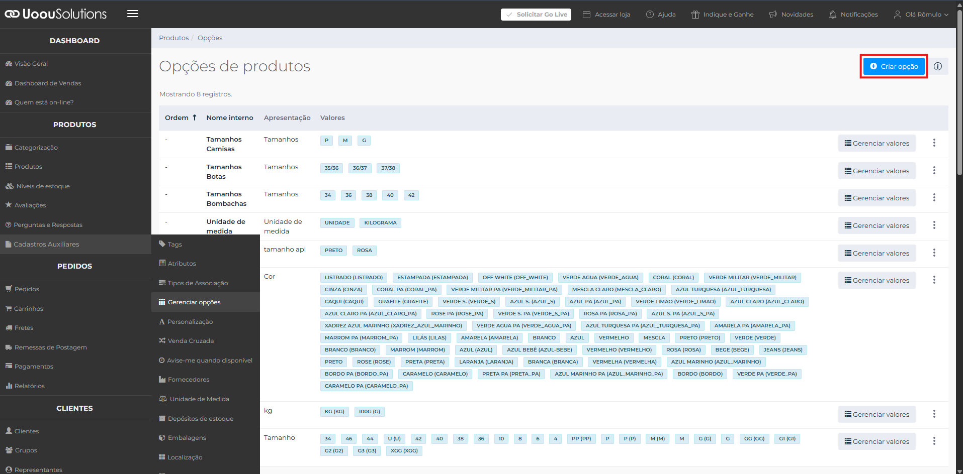 Se a variação desejada já existir (como cor e tamanho), não é necessário cadastrar uma nova opção.