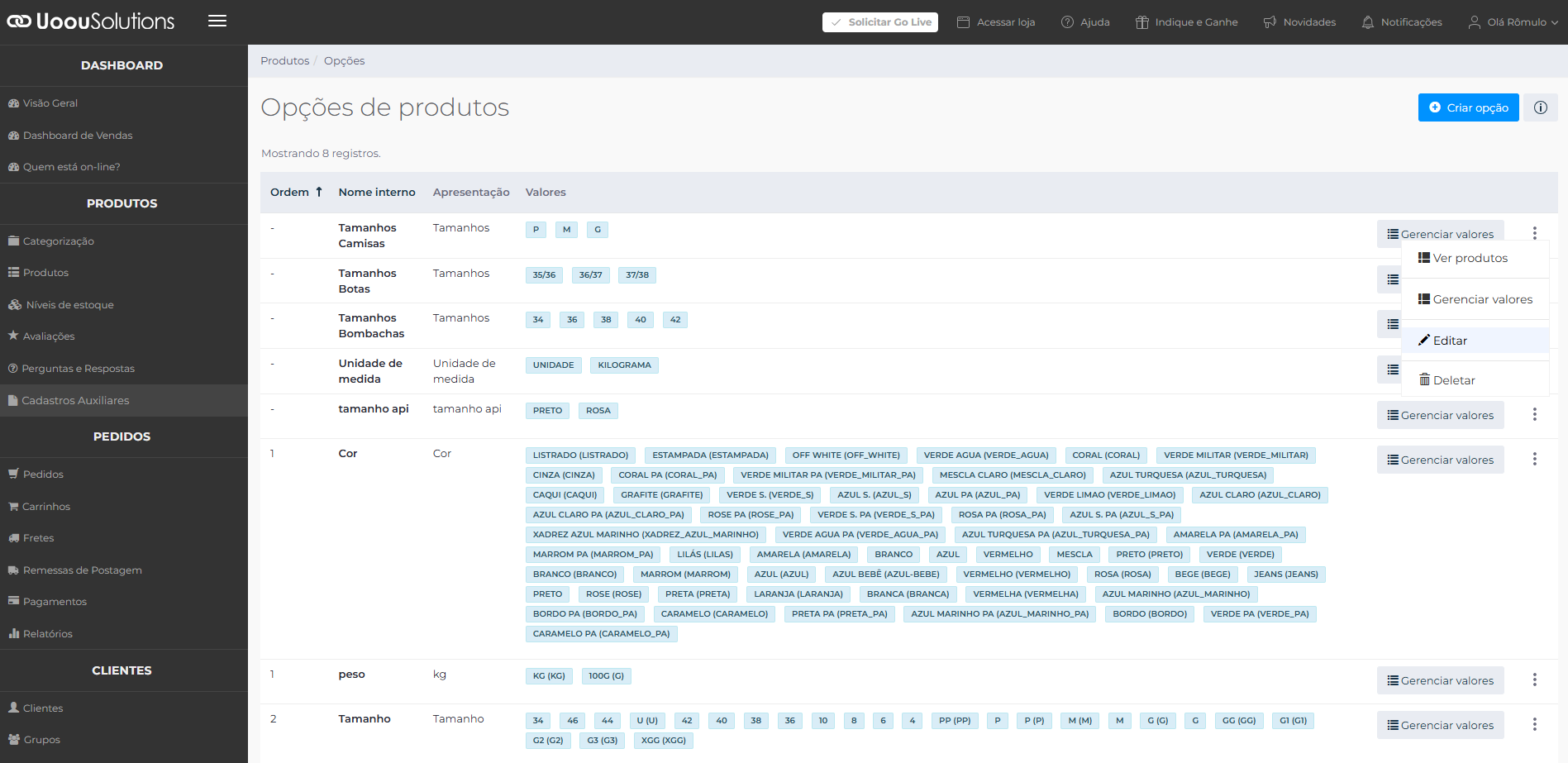 No painel administrativo, acesse Cadastros Auxiliares > Gerenciar Opções e selecione a opção que você deseja editar.