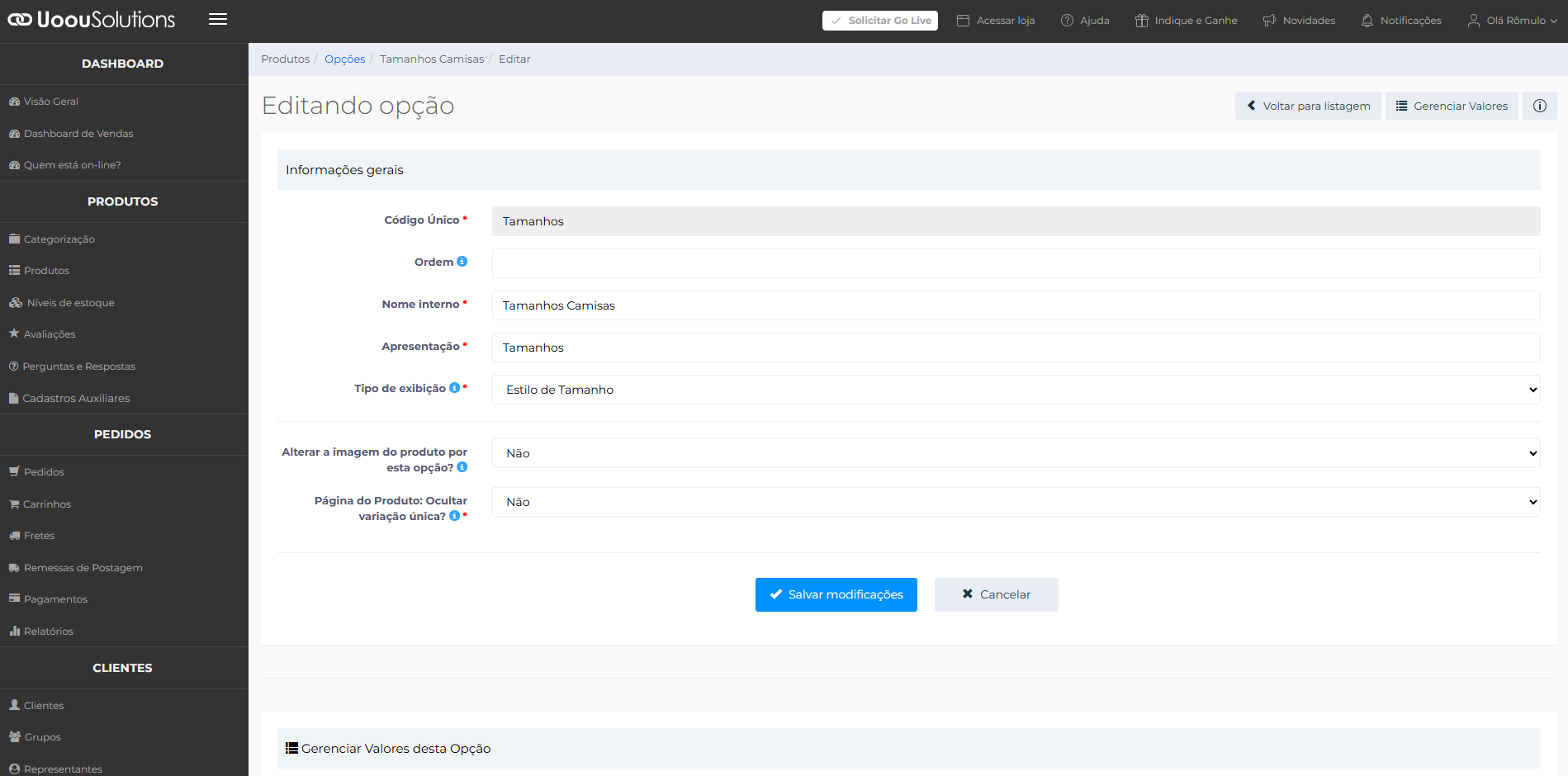 Este tutorial não aborda o cadastro e a edição dos valores de uma opção. Esse conteúdo está no tutorial Gerenciando os valores de uma opção.