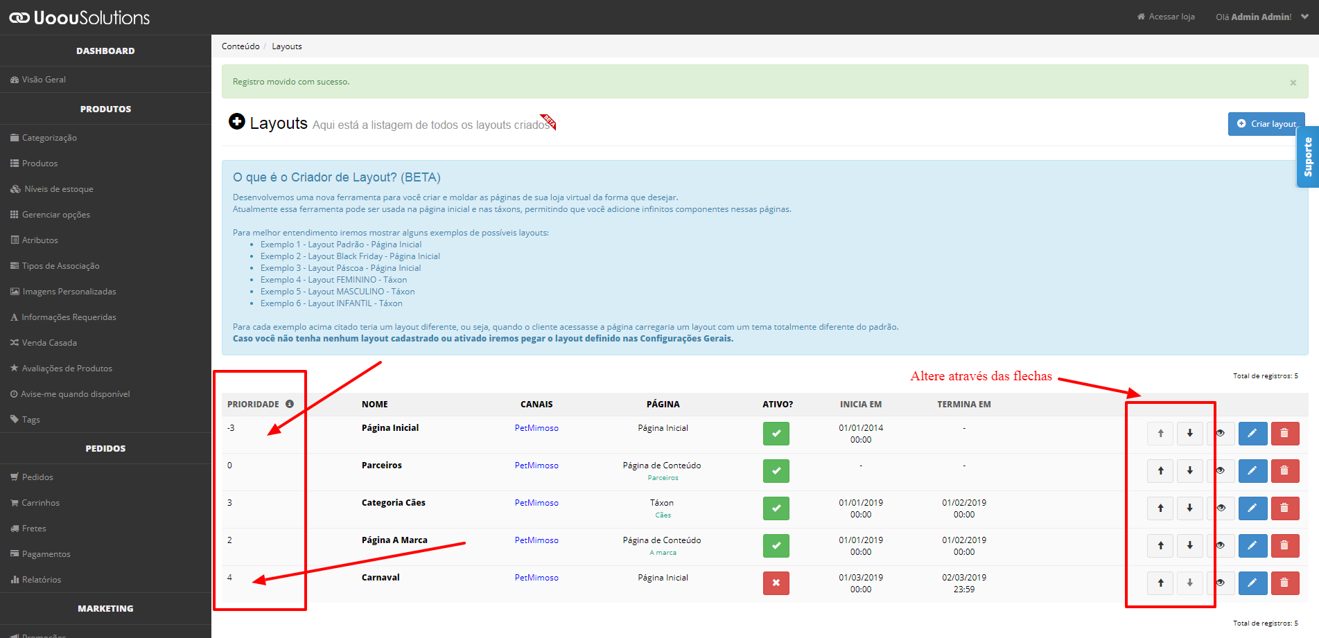 1- Após ter os layouts criados, basta posicionar através das flechas destacadas na imagem qual a posição desejada, quanto maior o número, maior a prioridade!