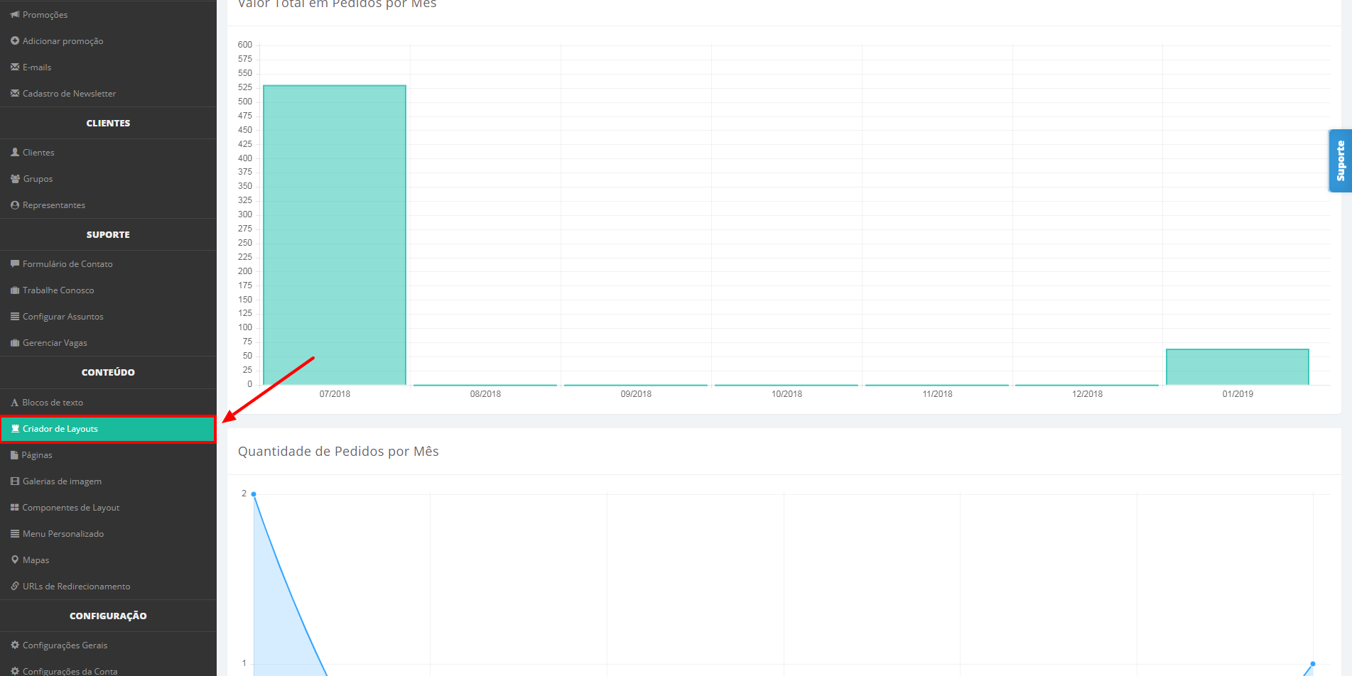 1- No Painel Administrativo, acesse o menu "Conteúdo" e escolha a opção "Criador de layouts"