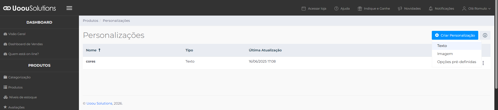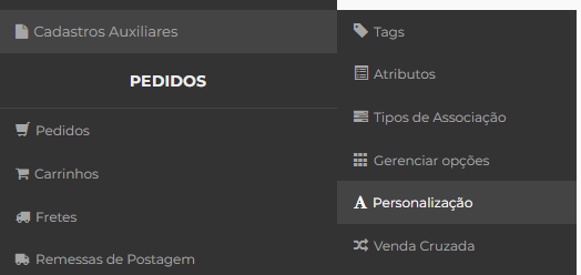 No Painel Administrativo, acesse Produtos > Cadastros Auxiliares > Personalização