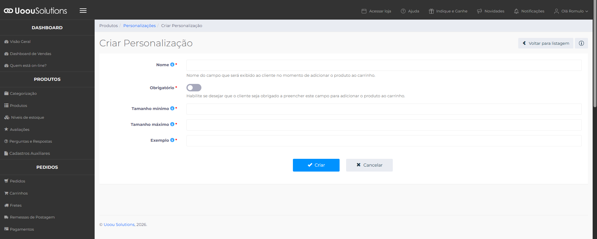 Para cadastrar uma personalização na sua loja virtual, siga as etapas abaixo.
