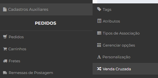 No Painel Administrativo, acesse Cadastros Auxiliares → Venda Cruzada.