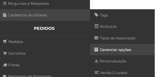No painel administrativo, acesse Produtos > Cadastros Auxiliares > Gerenciar Opções.