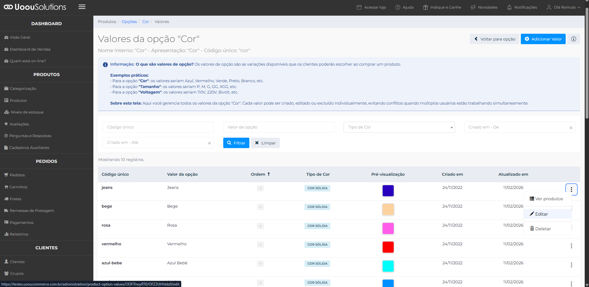 Para alterar a cor de uma das opções, clique no menu de opções da cor em questão, depois em Editar.