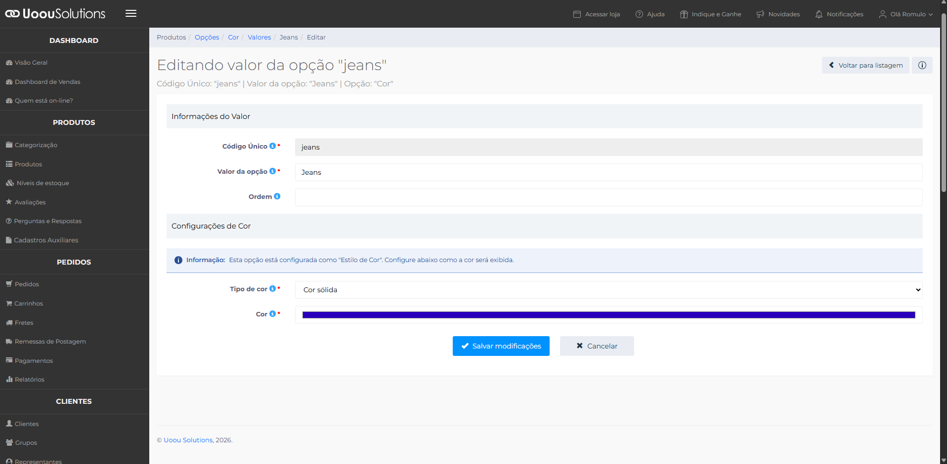 Ao acessar a tela de edição da cor, você deve clicar no campo Cor.