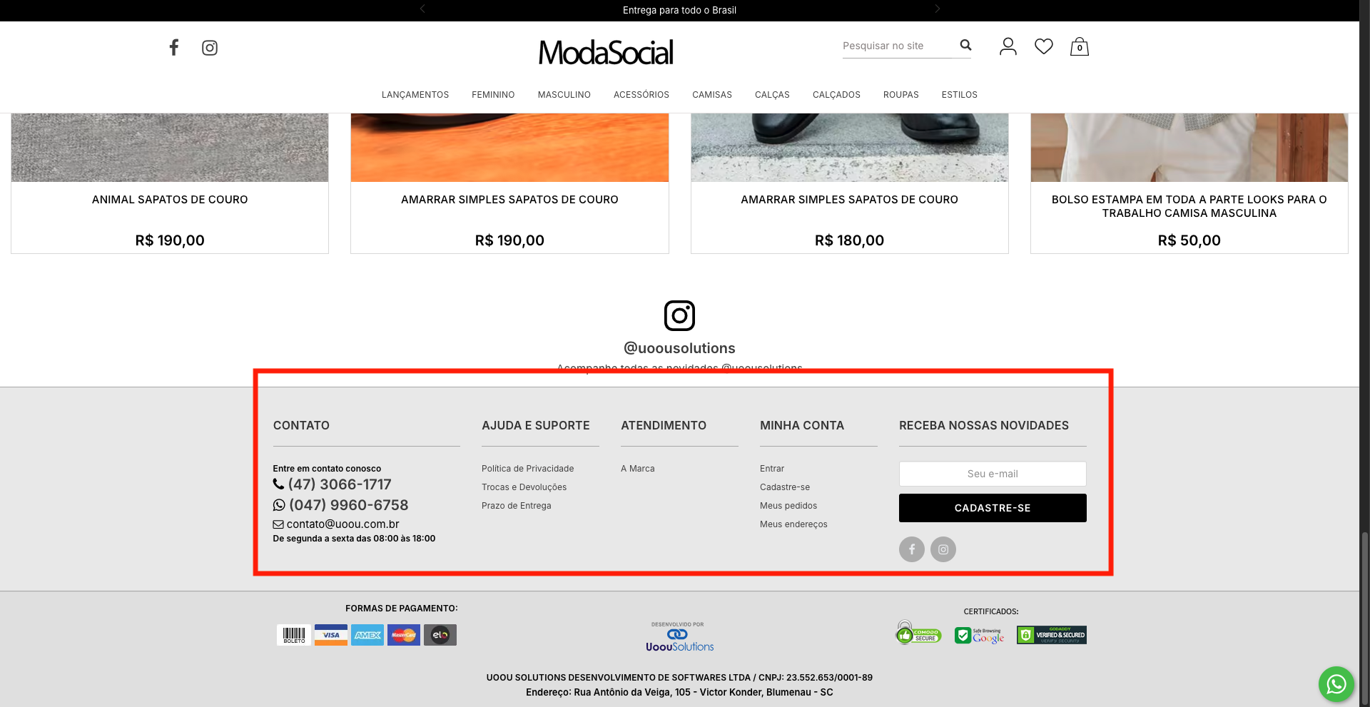 No rodapé de um e-commerce, alguns grupos de páginas podem ser configuráveis, enquanto outros são gerados automaticamente de acordo com as configurações da loja, como Mídias Sociais, Minha Conta e Contato.