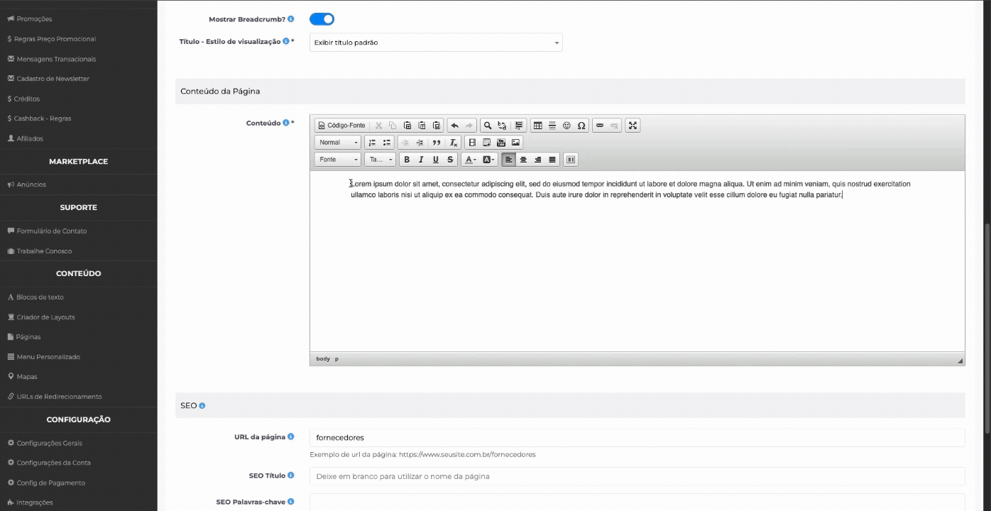 Este tutorial explica como alterar o conteúdo das páginas de conteúdo da loja virtual, incluindo a edição de textos, inserção de imagens e vídeos, aplicação de formatações, organização do layout do conteúdo e uso de tabelas, utilizando o editor disponível no painel administrativo.