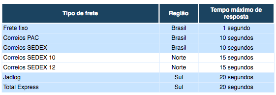 - É aconselhável a configuração de um tipo de frete de contingência, como uma tabela manual dos Correios, por exemplo, para ser acionada quando um tipo de frete atinge seu tempo máximo de resposta;