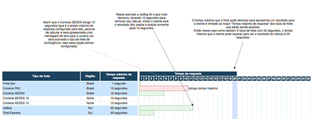 Nesse exemplo abaixo todos os tipos de frete ficaram abaixo do tempo máximo de resposta.