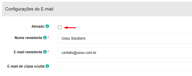 4 - Nas "Configurações do e-mail", na opção "Ativado", clique na caixa quadrada para desativá-lo:
