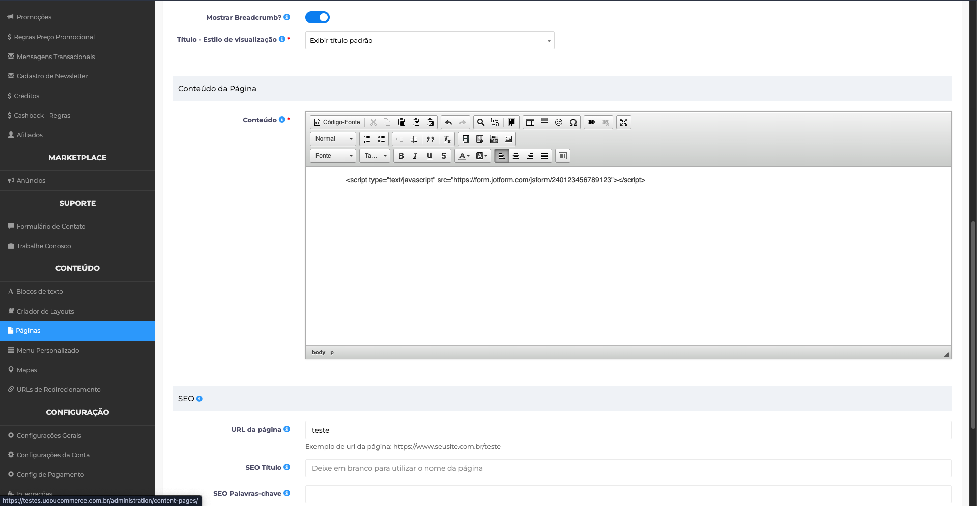 - Cole o código de incorporação no editor da página de conteúdo personalizada dentro da plataforma da Uoou Solutions. (Painel Administrativo > Conteúdo > Páginas > Editar)