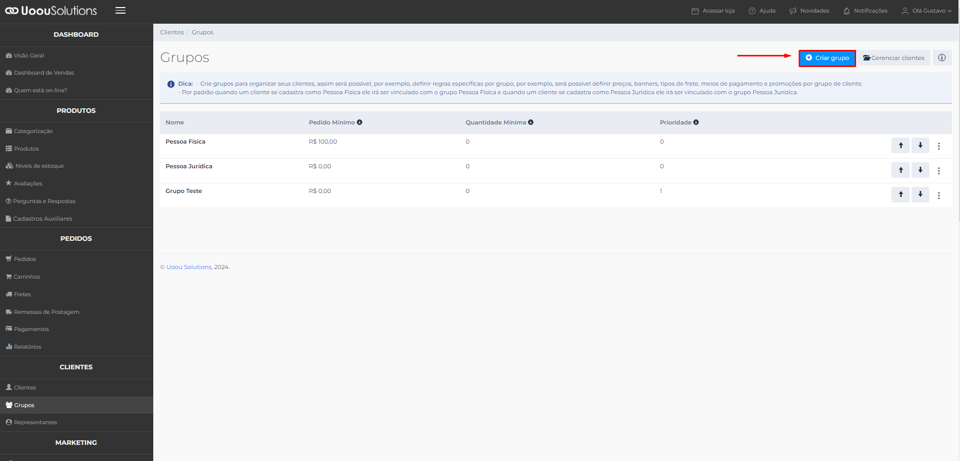 Mostrar como criar um grupo para organizar seus clientes sendo possível, por exemplo, definir regras específicas por grupo de cliente. É possível definir preços de produtos, visualização de banners, regras de frete, regras de meios de pagamento e promoções por grupo de cliente.
