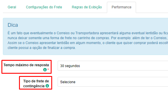Preencha o tempo máximo de resposta para esse tipo de frete (em segundos). Este campo serve mais efetivamente para os tipos de frete que fazem consultas a terceiros, por exemplo: Correios e Transportadoras (Total Express, Jadlog, Braspress, etc.)