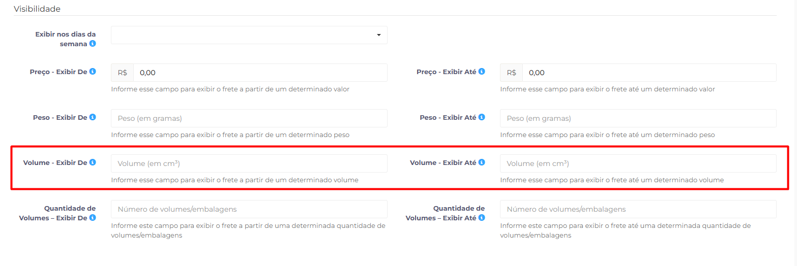 O pedido precisa ter um volume total, calculado por largura × altura × profundidade, entre os valores informados nos campos De e Até.