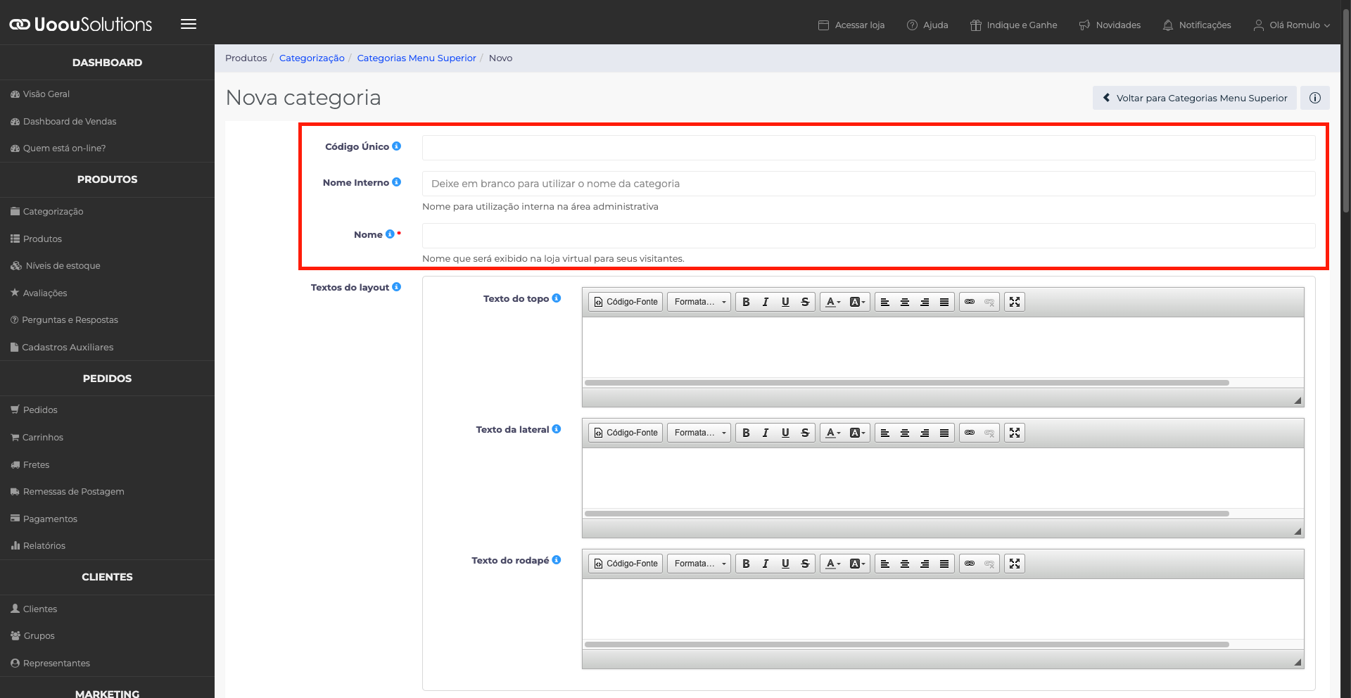 Este tutorial explica como criar uma categoria de produtos na plataforma da Uoou Solutions, detalhando todas as configurações disponíveis, desde os dados básicos até SEO, hierarquia, visibilidade, imagens, redirecionamento e descrição padrão.