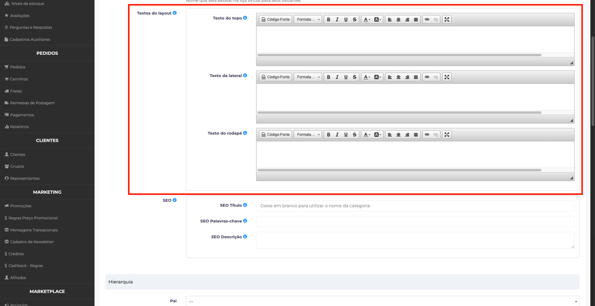 Na seção Textos do Layout, é possível adicionar conteúdos informativos à categoria, contribuindo para a experiência do usuário e para a indexação nos mecanismos de busca.