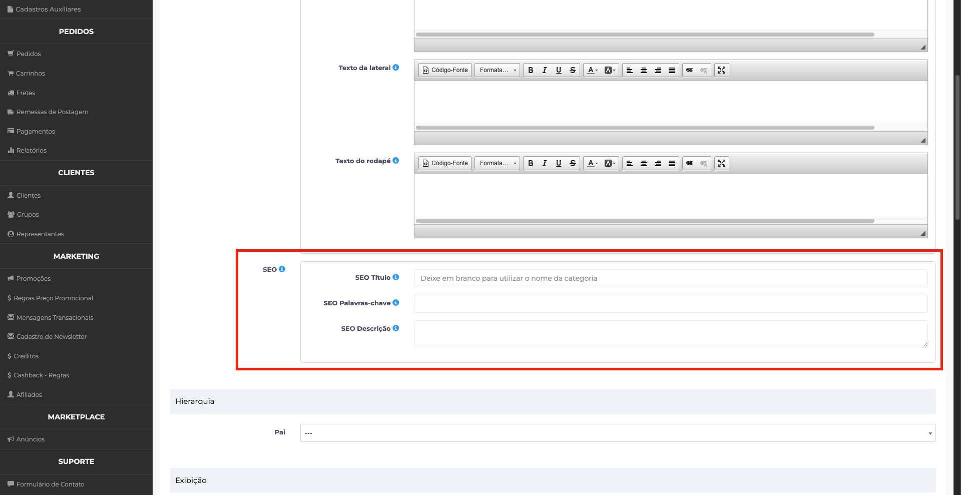 A seção SEO permite otimizar a categoria para mecanismos de busca:
