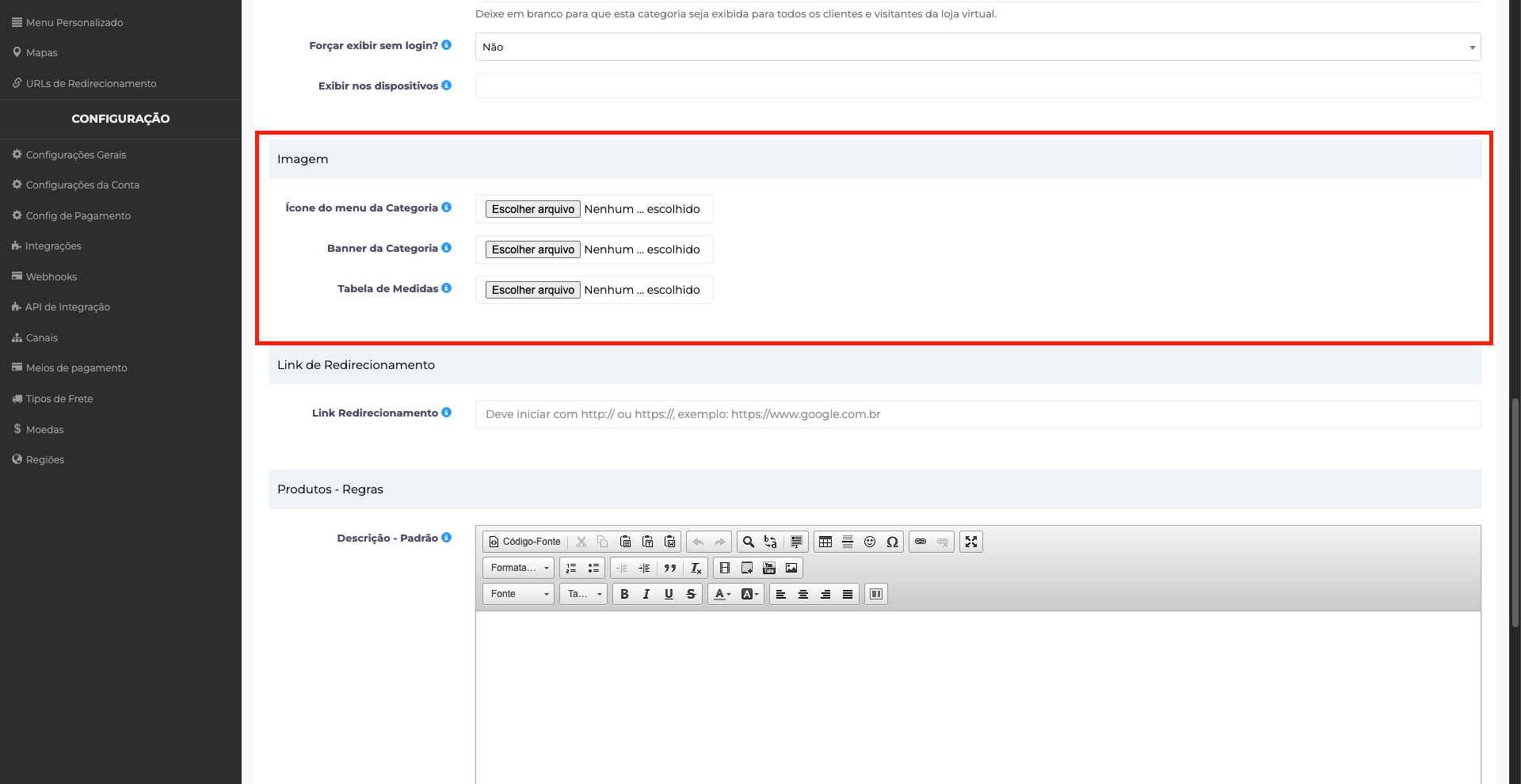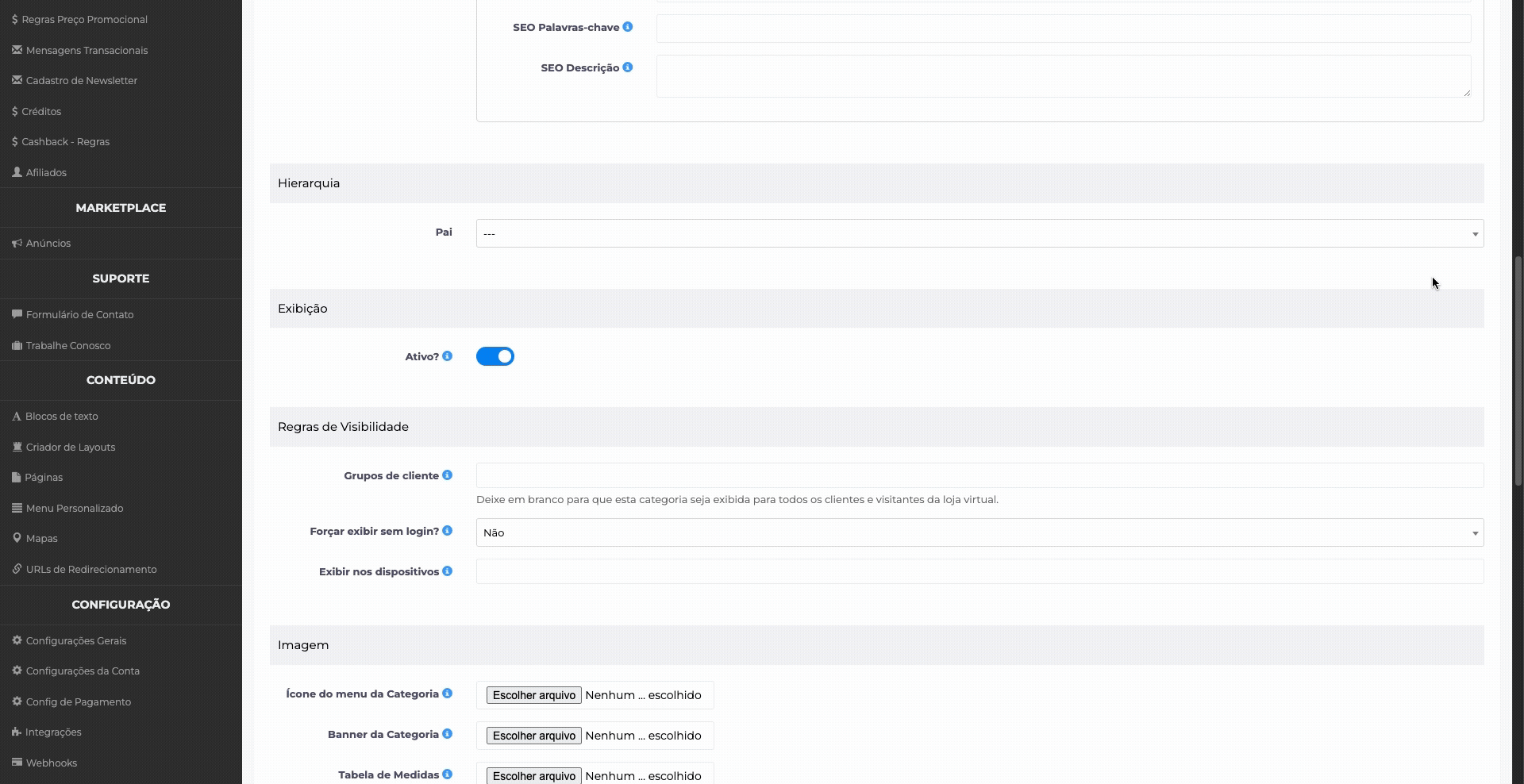 Canais: define em quais canais de venda a categoria será exibida