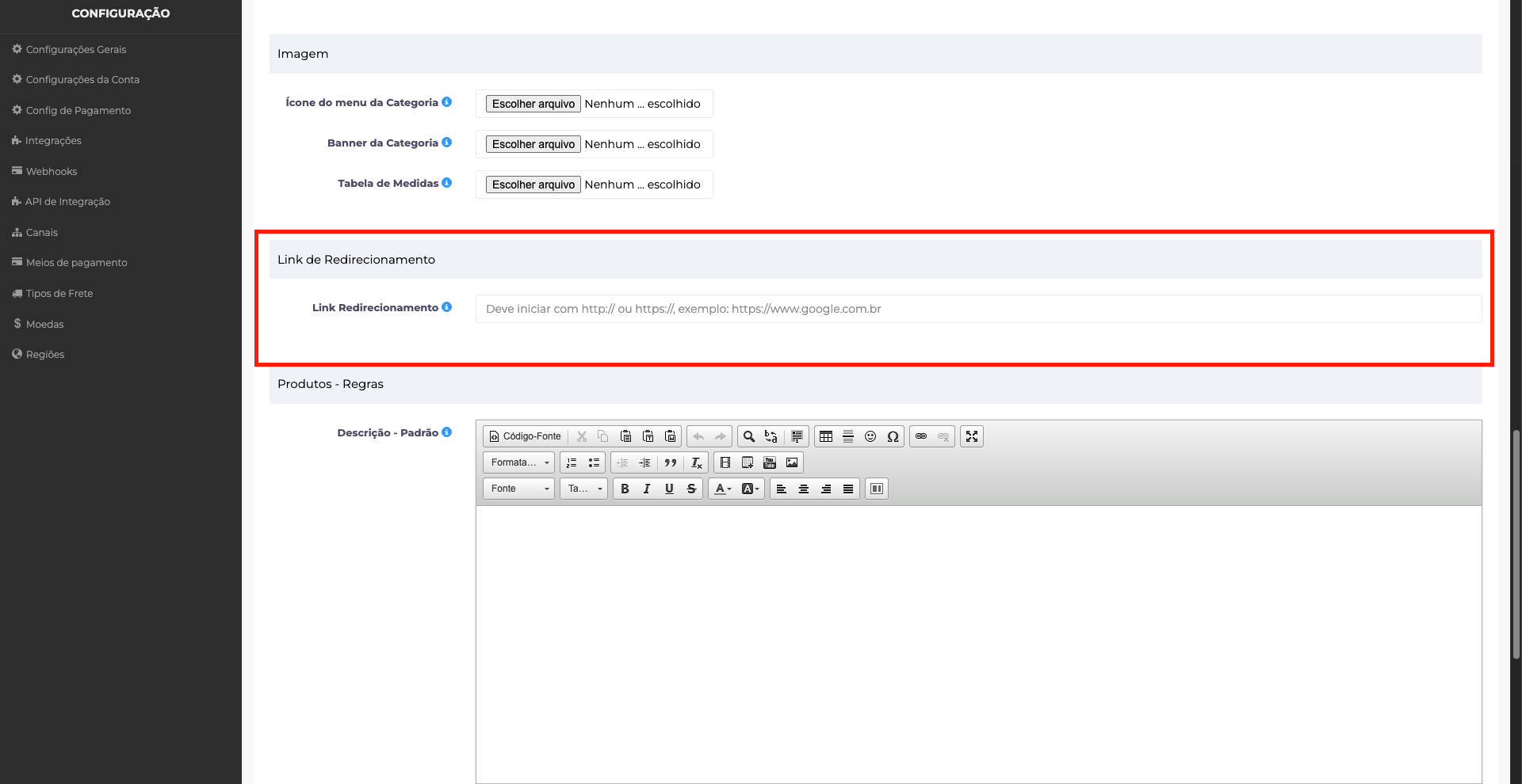 O Link de Redirecionamento permite forçar o direcionamento da categoria para um endereço específico. Esse recurso é indicado, por exemplo, para: