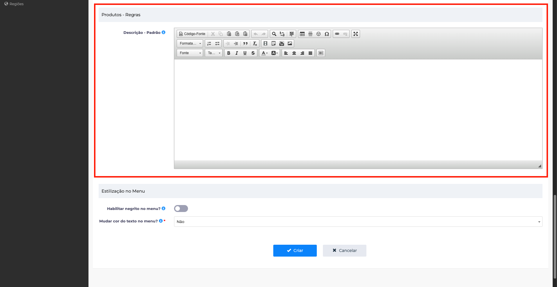 Em Descrição padrão, é possível definir um texto que será exibido na página de detalhes do produto. Essa descrição será aplicada automaticamente aos produtos vinculados à categoria que não possuírem descrição própria.
