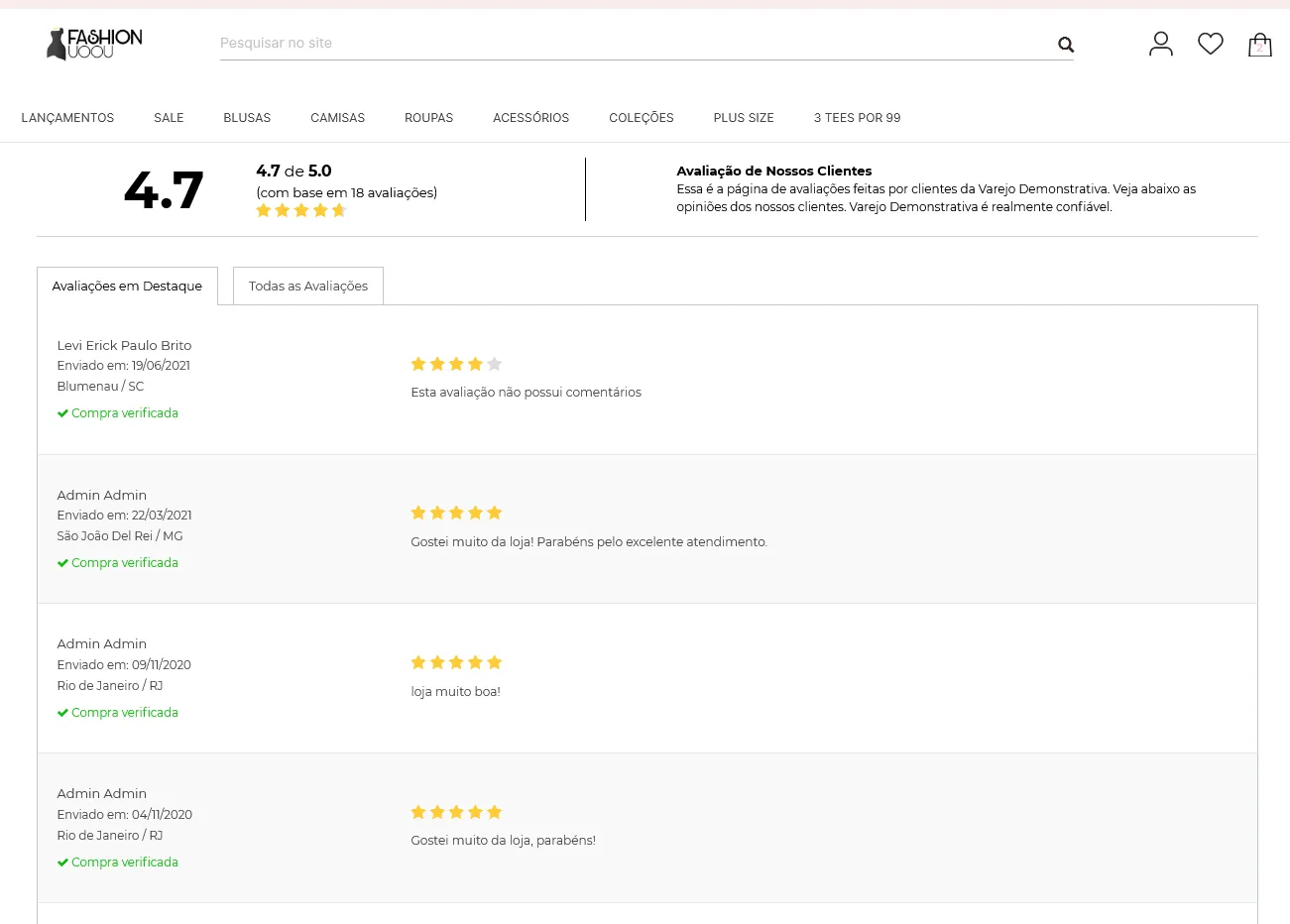 A plataforma permite habilitar uma página específica de Avaliação da Loja, onde as avaliações ficam visíveis publicamente. Dessa forma, novos clientes podem consultar as opiniões antes de finalizar uma compra.