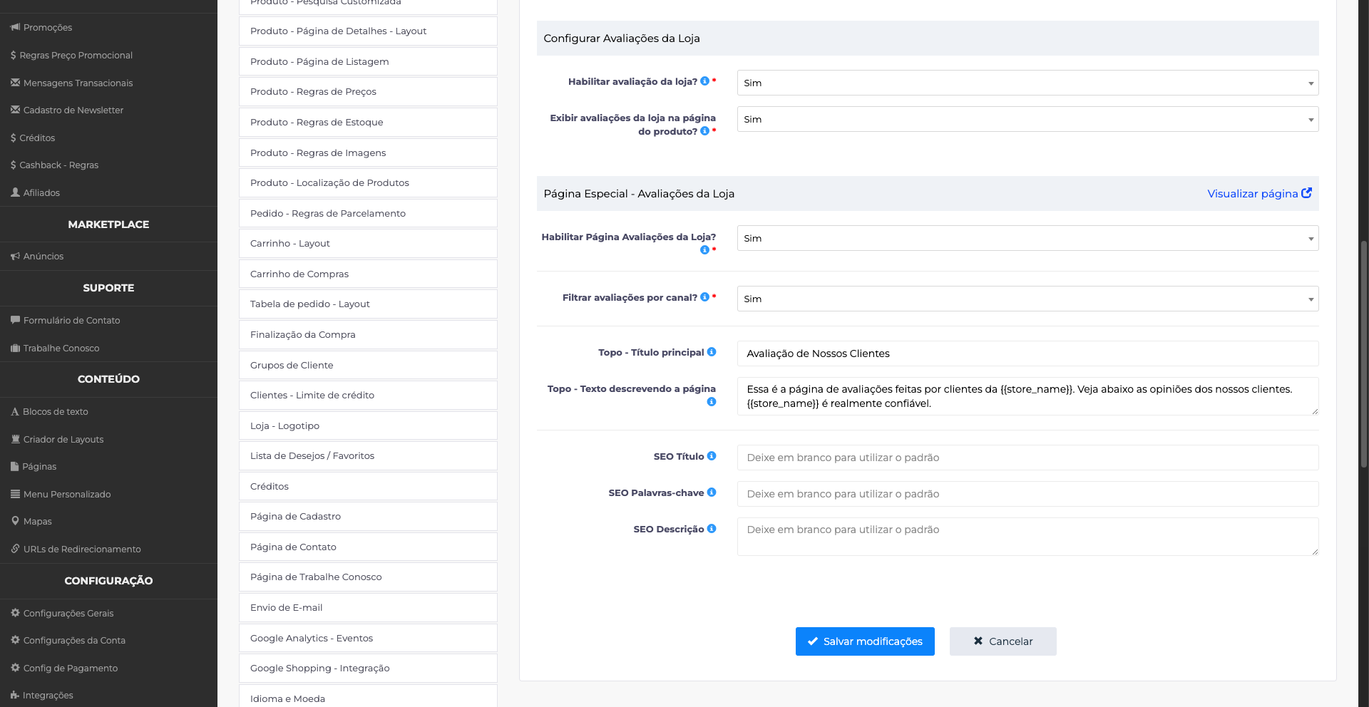 Também é possível visualizar a página de Avaliação da Loja antes de habilitá-la, garantindo que a apresentação esteja adequada ao layout e à estratégia da loja.