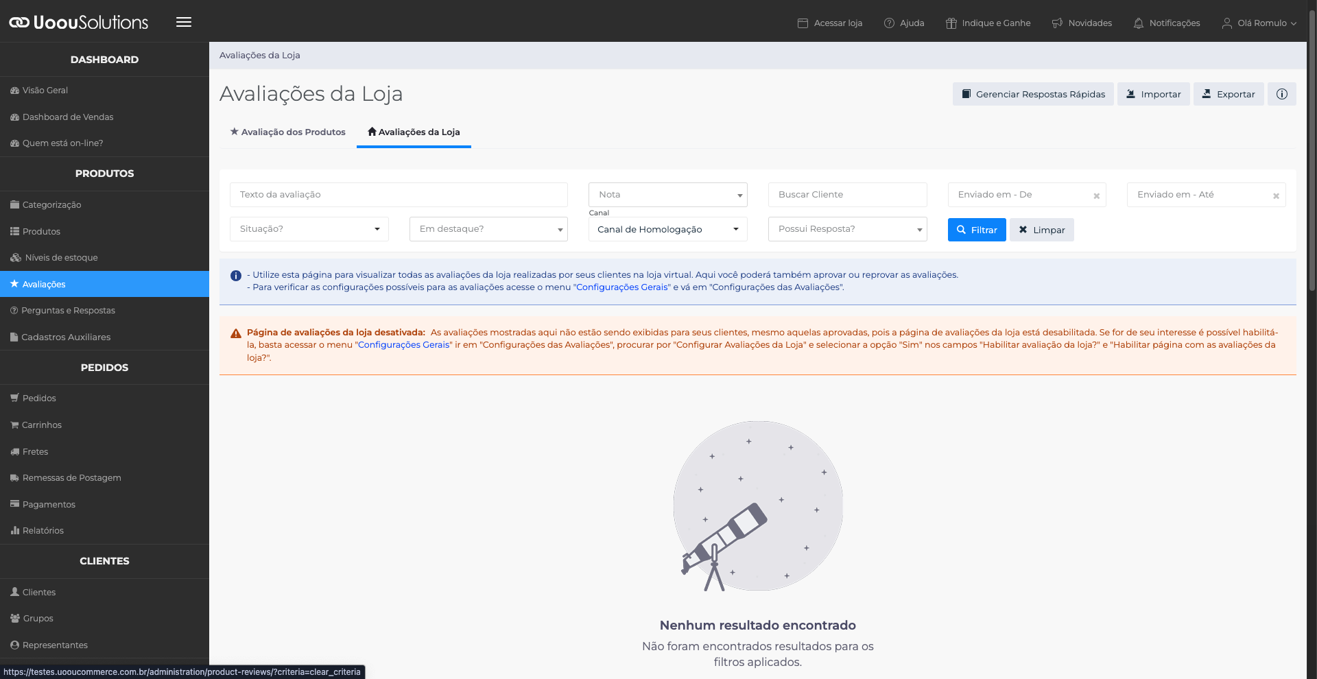 No painel administrativo da Uoou Solutions, a página de Avaliação da Loja pode ser habilitada e configurada em Configurações Gerais. Nesse local, é possível ajustar as opções relacionadas à exibição das avaliações.