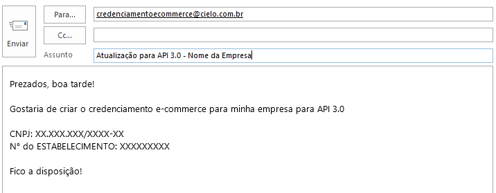 1º Passo: Para criar a afiliação e-commece é simples, basta enviar um e-mail para credenciamentoecommerce@cielo.com.br, solicitando o credenciamento da sua loja para a API 3.0 da Cielo!