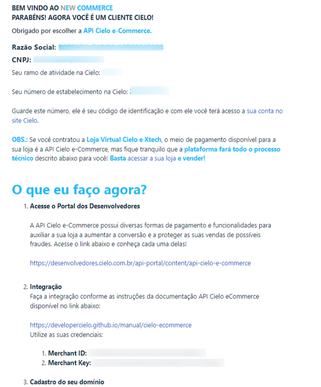 2º Passo: Após o envio de e-mail, a Cielo deve retornar com um e-mail parecido com este, informando que o cadastro para a API deu certo ou não.