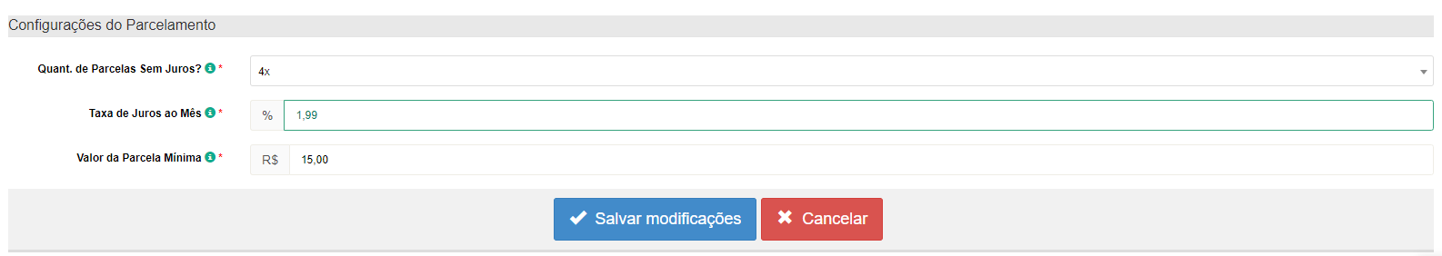 - No campo "Valor da Parcela Mínima" você consegue definir o valor mínimo permitido para parcelamento.