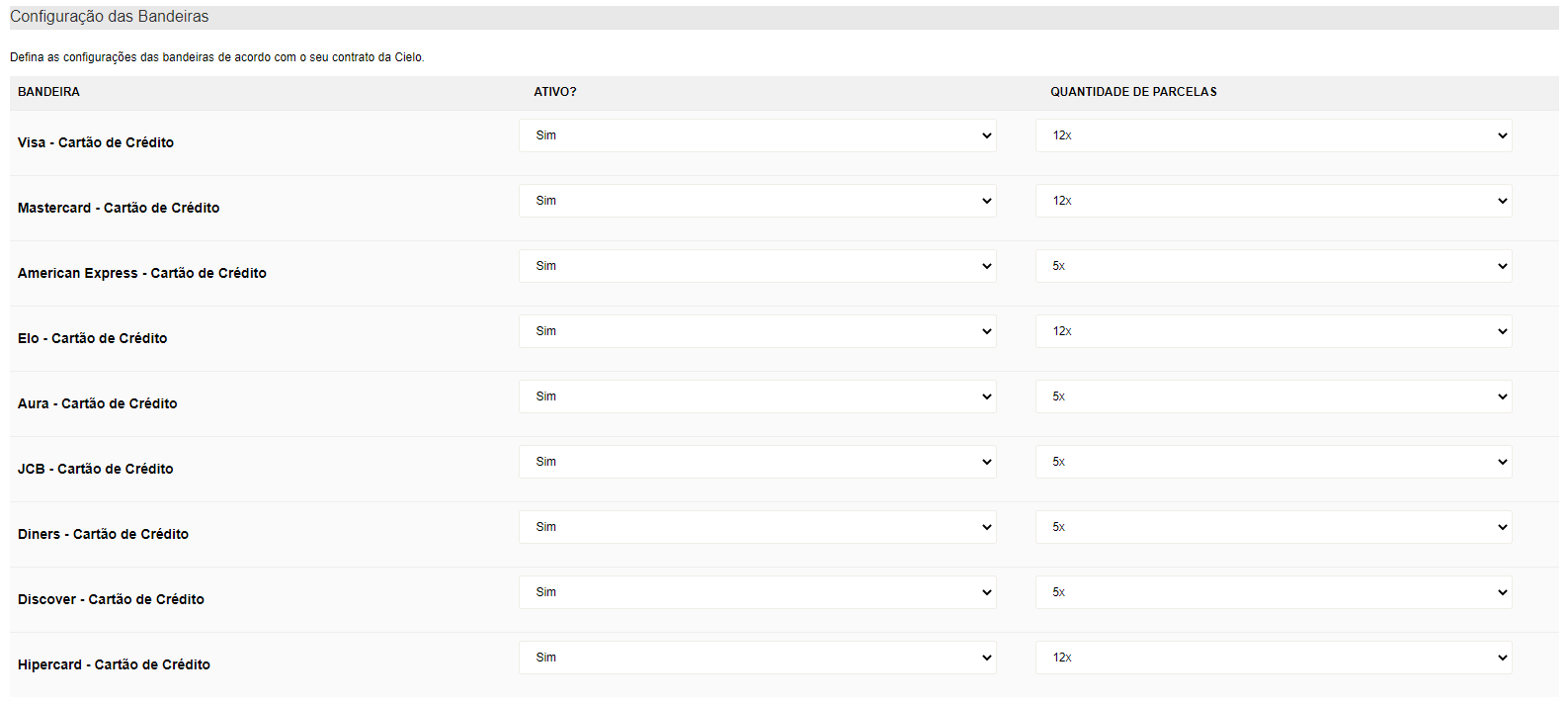 - Em "Configuração das Bandeiras" você deve definir as configurações das bandeiras de acordo com o seu contrato da Cielo, ou seja quais bandeiras vai aceitar e em quantas parcelas será possível realizar a compra.