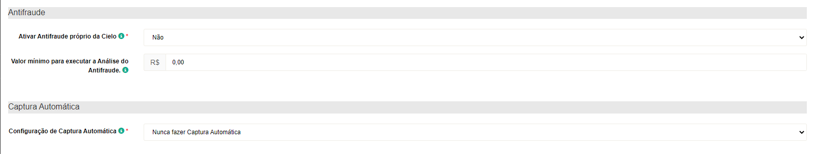 - Em "Valor mínimo para executar a Análise do Antifraude." você consegue definir, caso tenha o antifraude ativo em sua conta, o valor em que será executado o antifraude. Se você deseja que todas as vendas em sua loja virtual passem pela a Análise do Antifraude mantenha esse campo em branco.