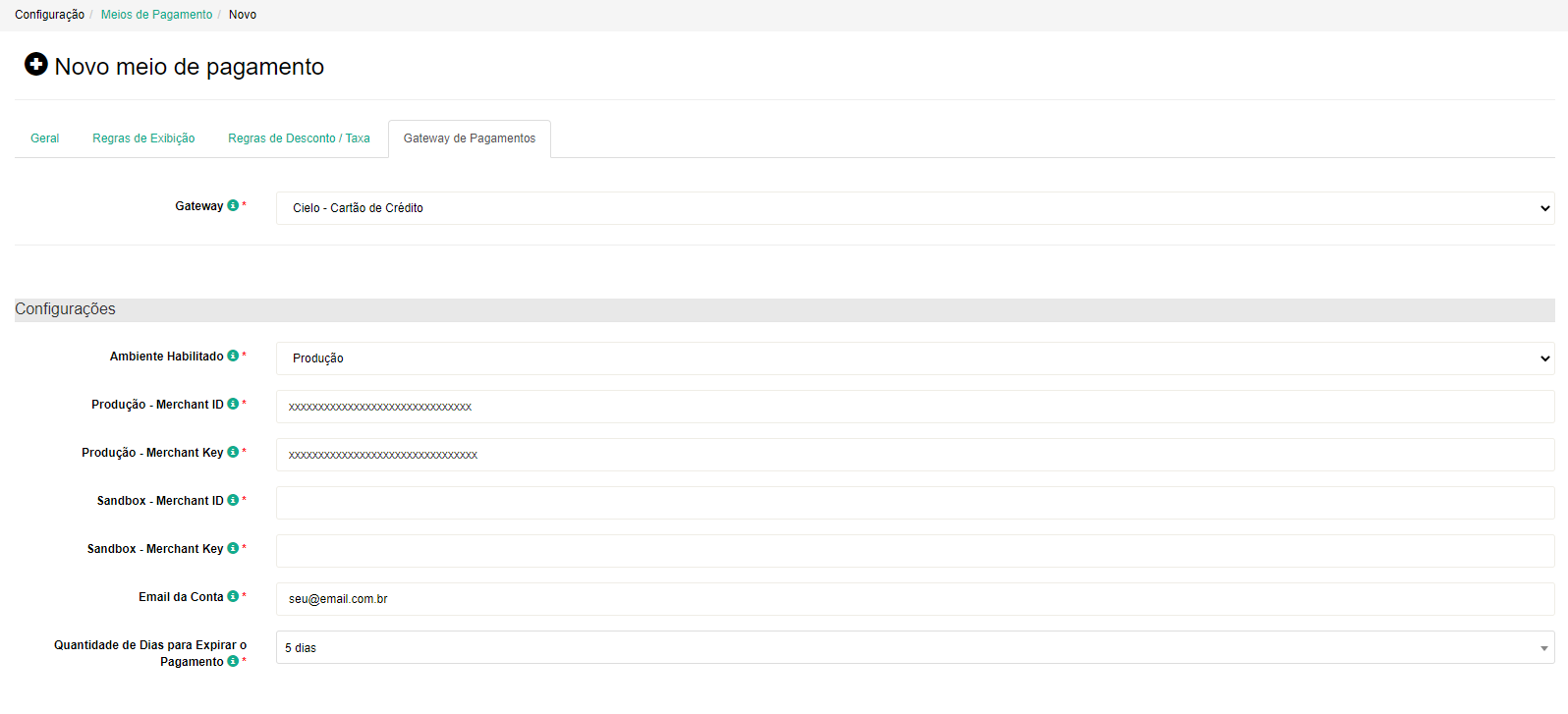 Configurando o novo meio de pagamento