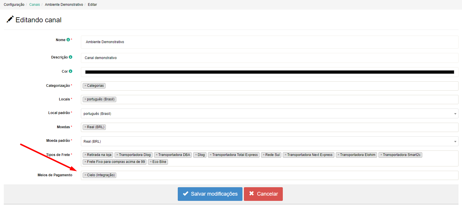 3º Passo: Na edição do canal, no campo "Meios de Pagamento" insira os meios de pagamentos desejados e salve as alterações!