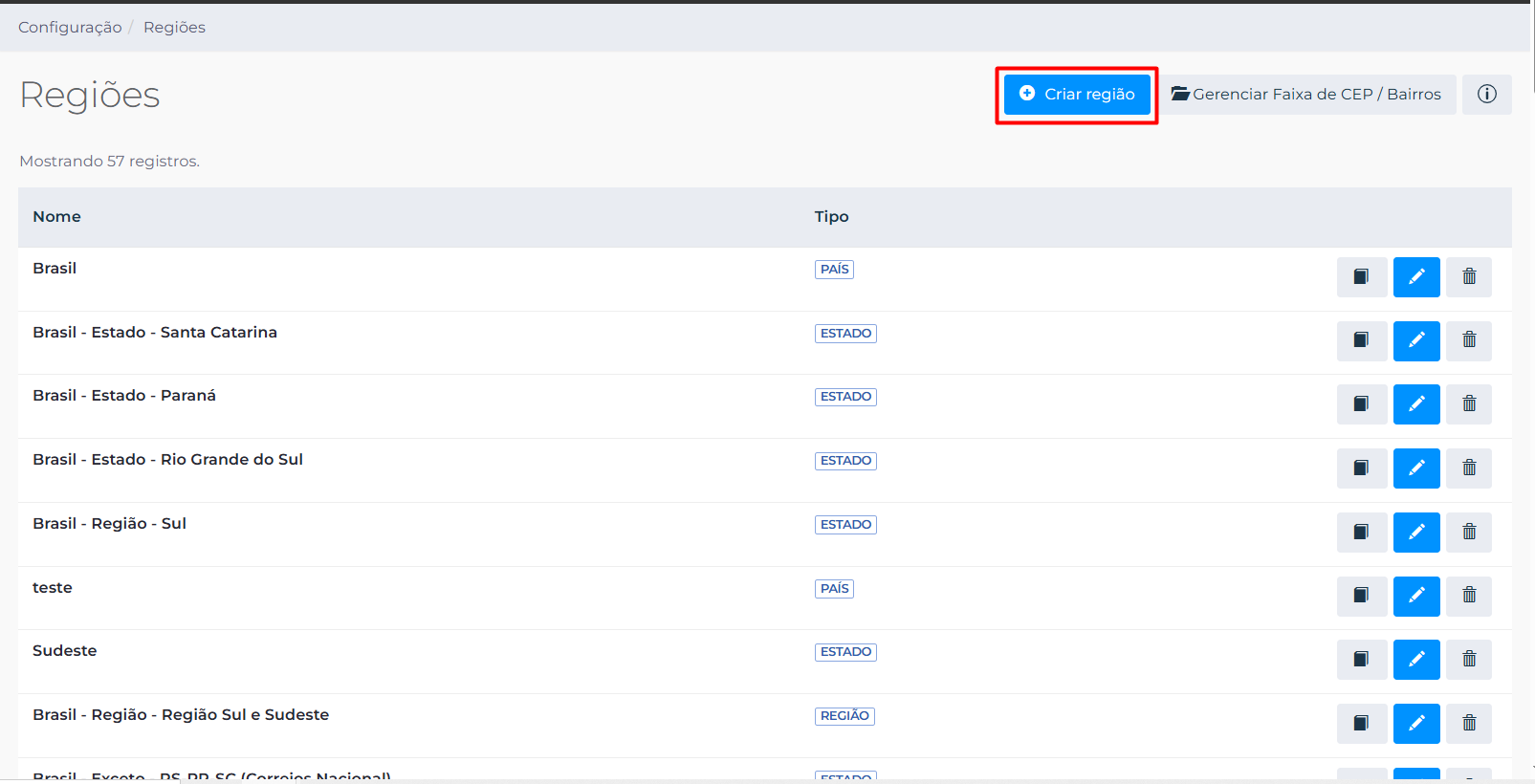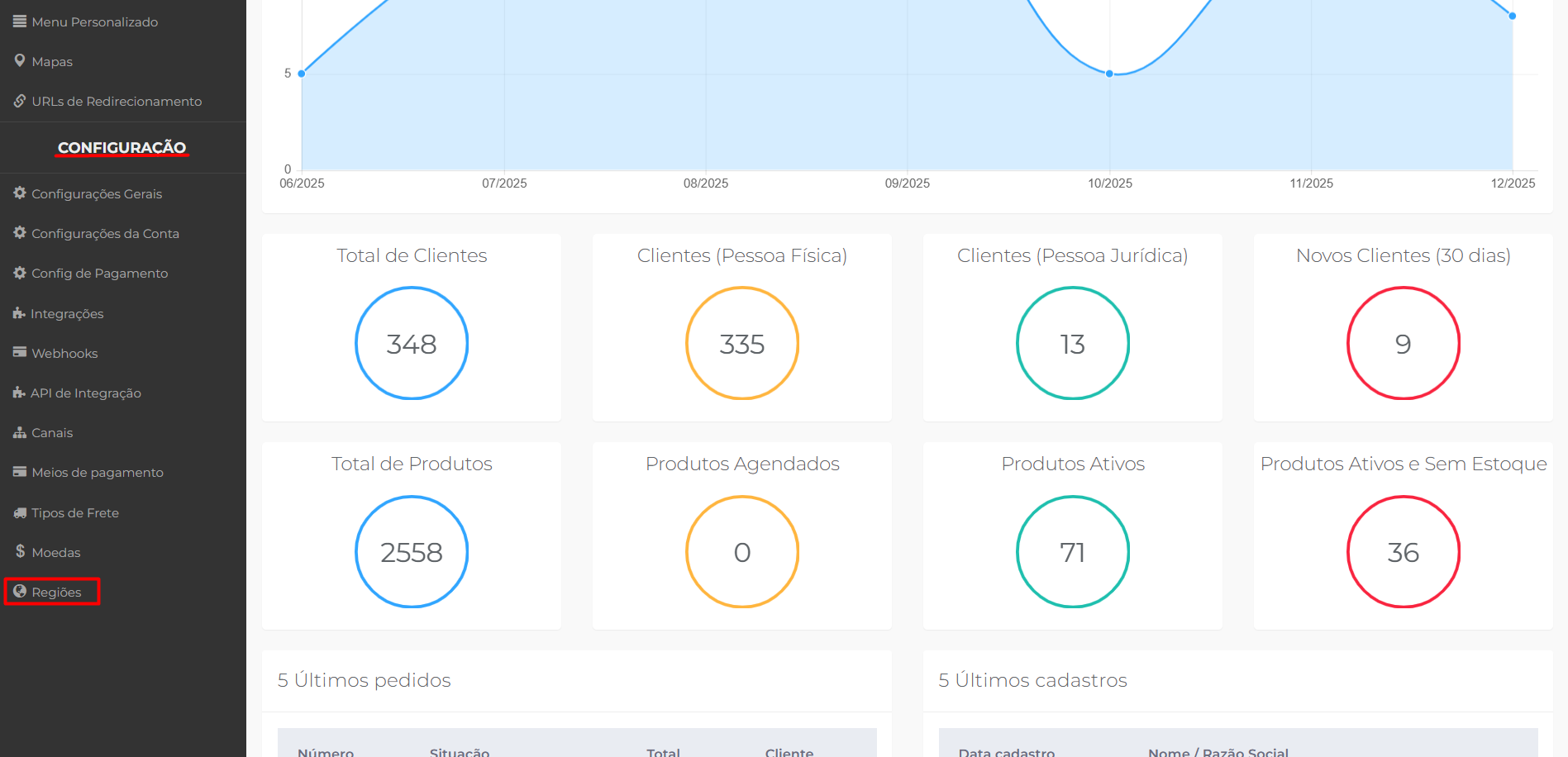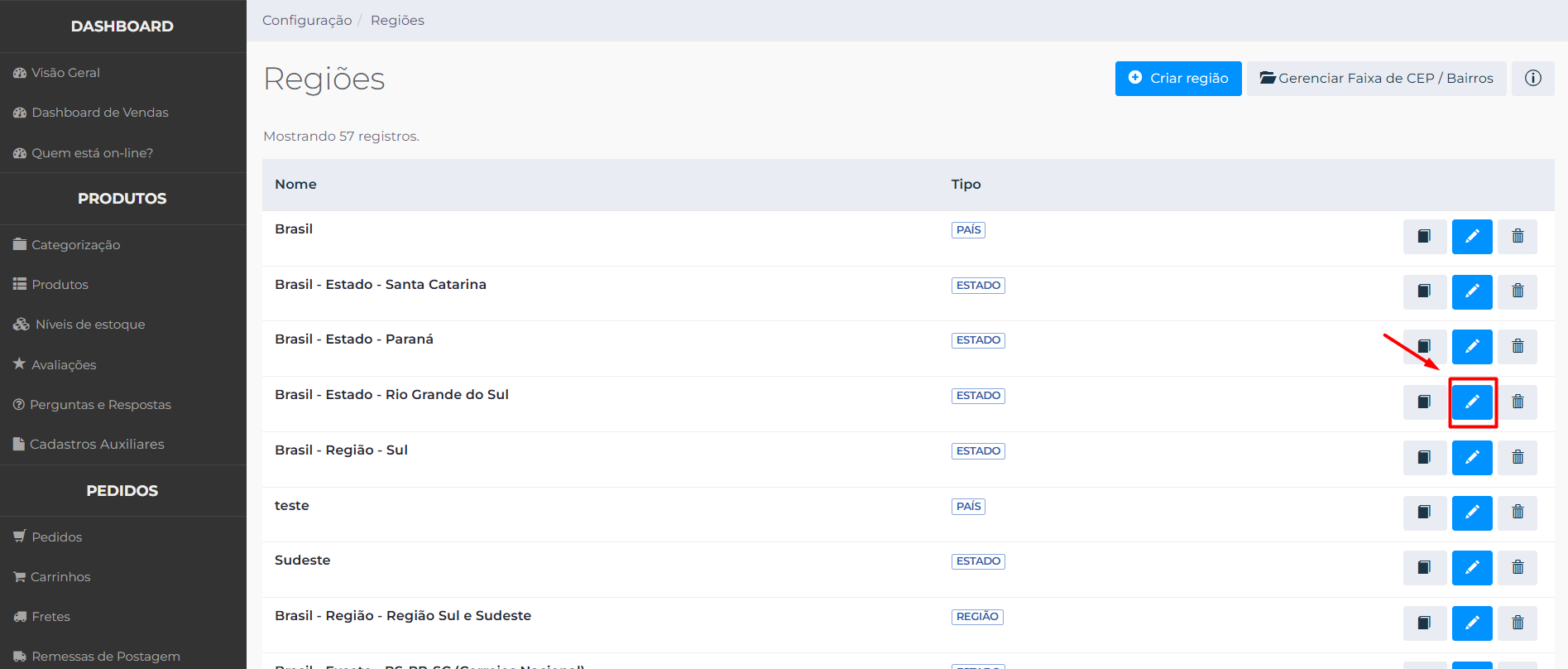 - No menu do painel administrativo, vá até o grupo "Configuração" e clique em "Regiões":