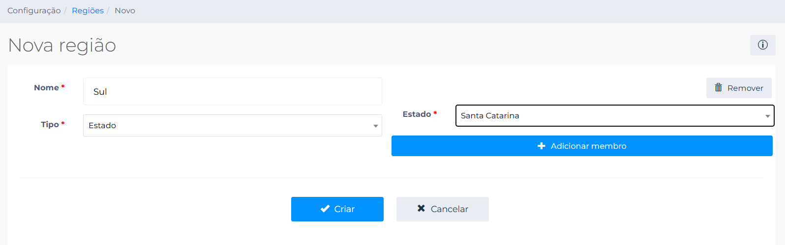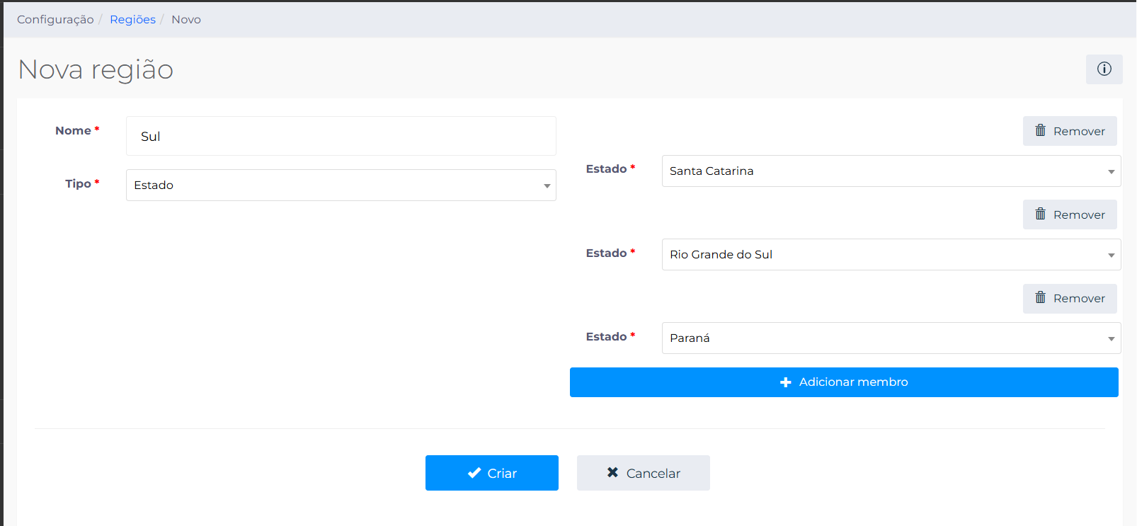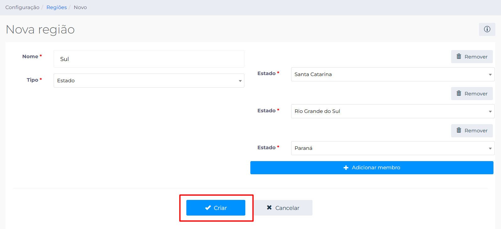 Neste caso, vamos criar uma região para todo sul do País, então vamos seguir com a opção Estado.