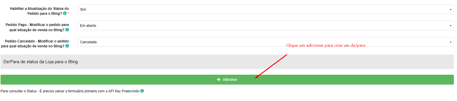 Para funcionar a consulta do código do status do Bling para poder fazer o de/para, é necessário primeiro informar a API Key do seu Bling, salvar o formulario para depois poder consultar os Status.