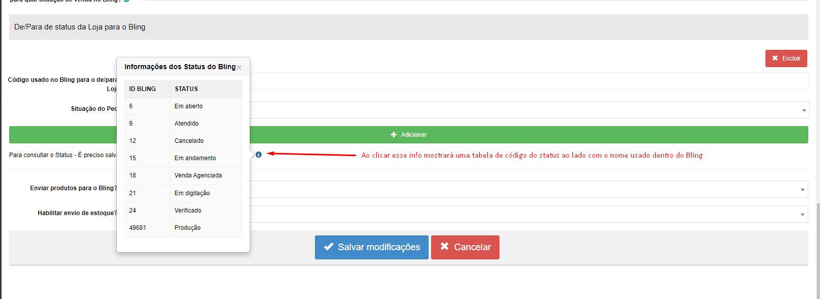 Ao clicar no info mostrará uma tabela do código do status ao lado o nome do status dentro do Bling.