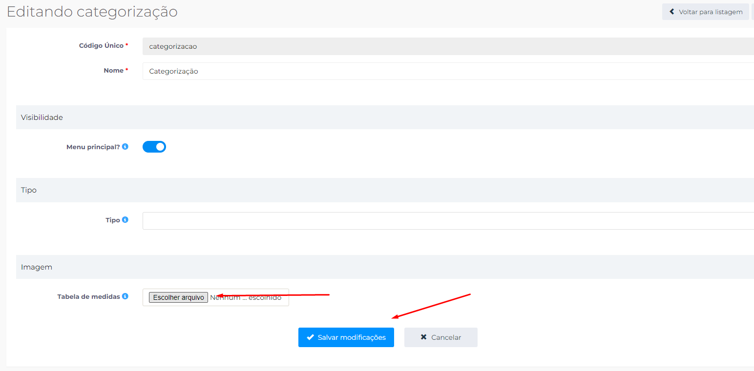 3ºPasso: Na edição da taxonomia, insira a imagem no campo "Tabela de medidas".
