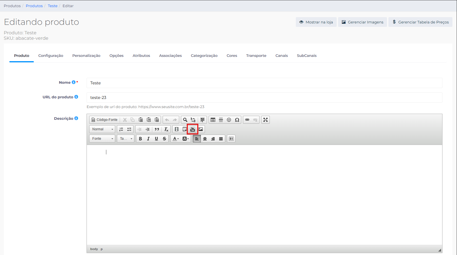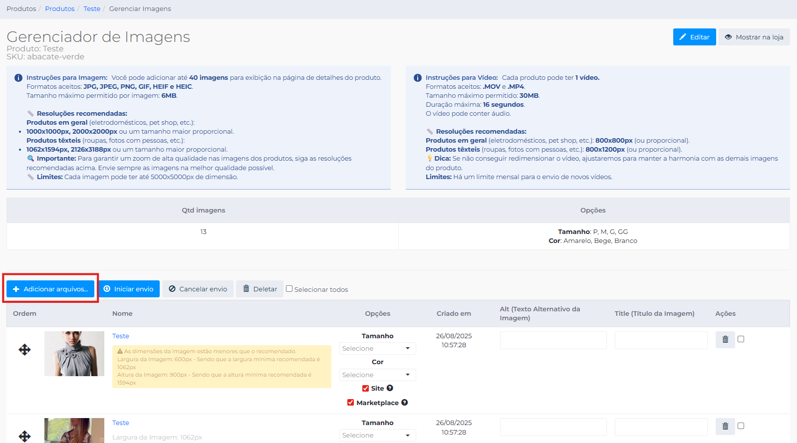 A inserção de vídeo na listagem é realizada a partir do gerenciamento de imagens do produto.